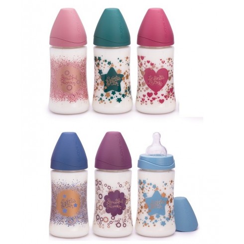 El Biberón PP Boca Ancha T Silicona Suavinex Premium de 150 ml cuenta con tetina de 3 posiciones, lo que permite adaptarse al ritmo de succión del bebé simplemente girando el biberón. Coloca justo debajo de su nariz la señal que indica mayor o menor salida de líquido y gira el biberón para cambiar la posición durante la toma: - poco: especial para los primeros días, para las tomas de glucosa y/o agua. - medio: ideal para la leche, zumos y papillas muy líquidas. - mucho: adecuada para papillas y para bebés muy comilones.