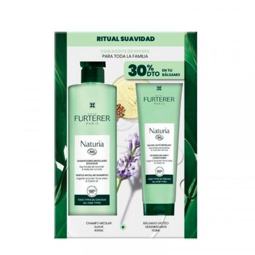 Este champú de uso frecuente limpia suave y eficazmente todo tipo de cabellos. Gracias a la tecnología micelar, captura eficazmente las impurezas sin deshidratar la fibra capilar ni irritar el cuero cabelludo.\r\nEste producto de cuidado delicadamente perfumado y certificado orgánico, con aceite de ricino y agua floral de lavanda orgánica cultivada en Francia, está probado dermatológicamente y es apto para su uso en niños. Perfectamente limpio, el cabello queda bonito y sano, se vuelve suave, flexible y ligero.\r\nNaturia Champú micelar suave puede utilizarse a partir de los 3 años y en combinación con los tratamientos capilares de René Furterer.\r\n\r\n