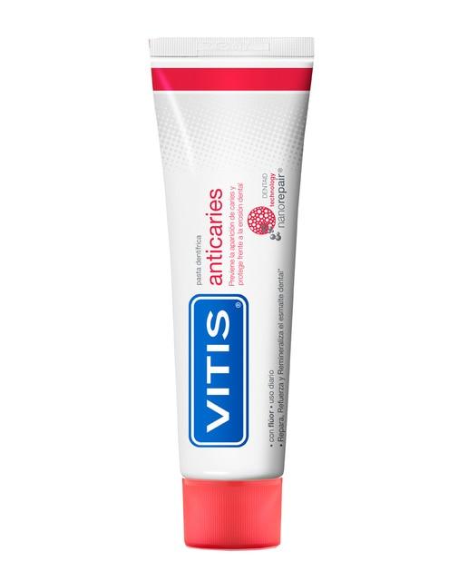 VITIS anticaries, con nanopartículas de hidroxiapatita, flúor y xylitol, es el único dentífrico con 3 mecanismos de acción específicos para la prevención de la caries y protección frente a la erosión dental. VITIS anticaries repara el esmalte dañado, llegando hasta su interior; forma una capa protectora resistente a la erosión; refuerza y fortalece el esmalte; y remineraliza el esmalte.Modo de Empleo: