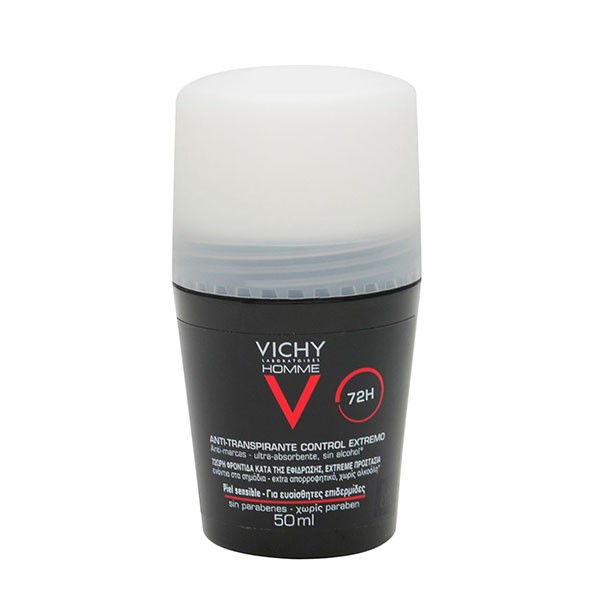 Este desodorante 72 horas Vichy Homme Antitranspirante Extreme Control proporciona un control del olor y el sudor de larga duración 72 horas, incluso en caso de transpiración excesiva. Es un antitranspirante 72 horas testado bajo control dermatológico, en pieles sensibles. Fórmula hipoalergénica.